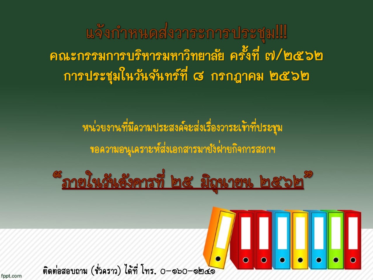 > แจ้งกำหนดส่งวาระการประชุม ก.บ.ม. ครั้งที่ ๗/๒๕๖๒